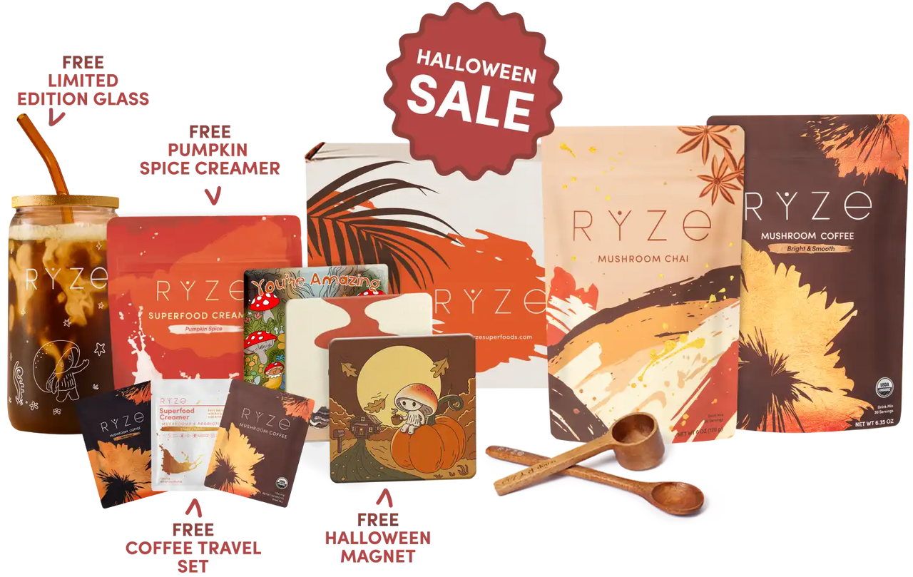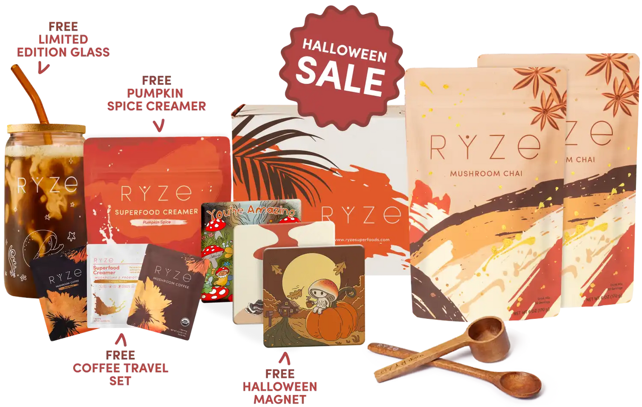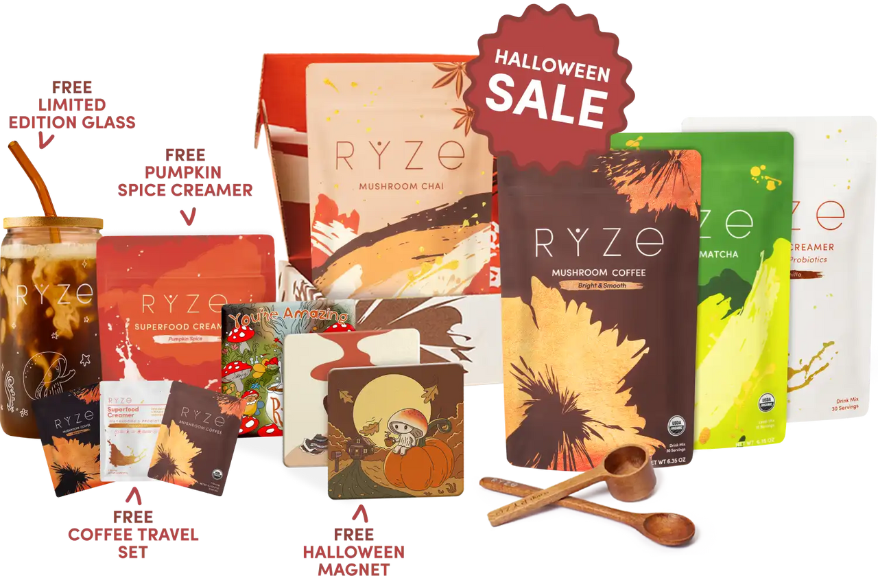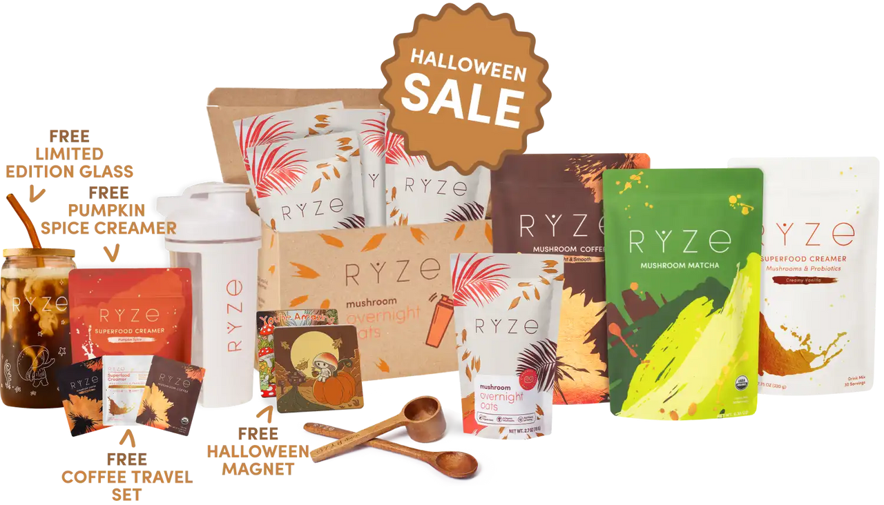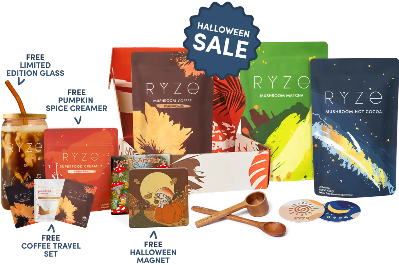 RYZE Mushroom Coffee (30 Servings) RYZE Mushroom Matcha (30 Servings) RYZE Mushroom Chai (20 Servings) RYZE Superfood Creamer (First Order)
