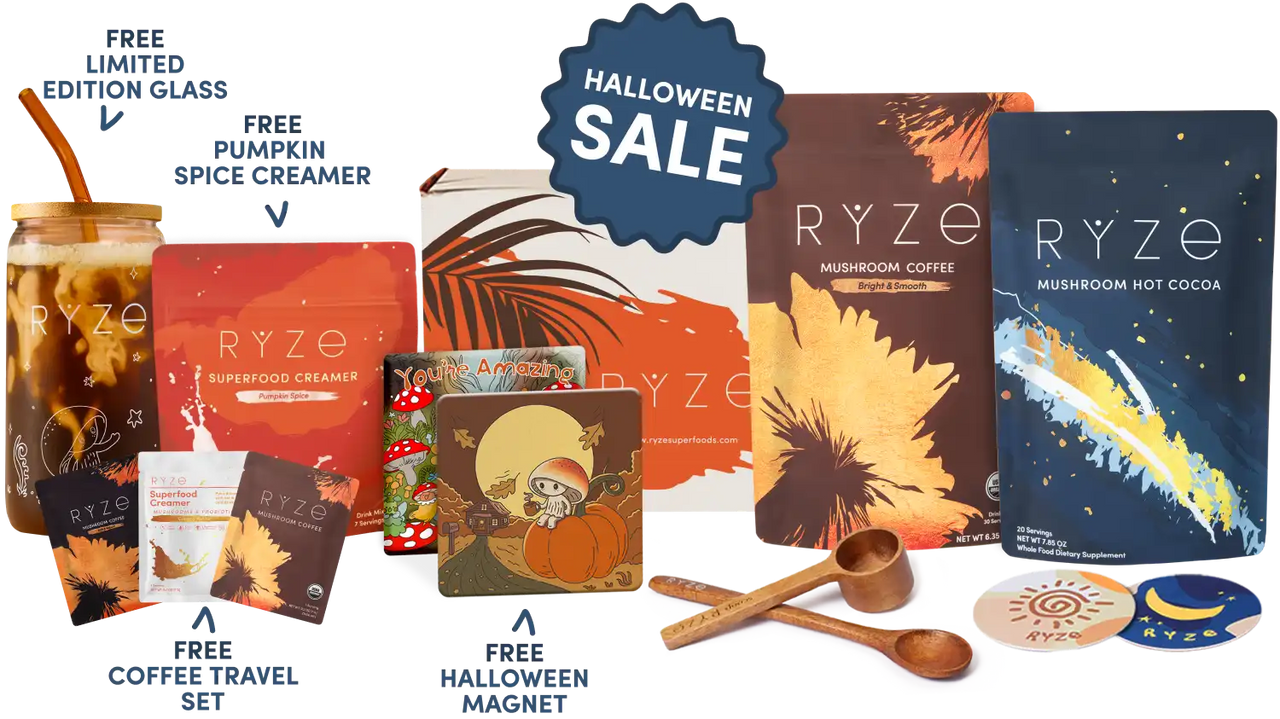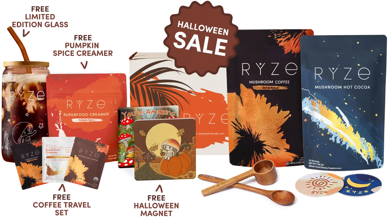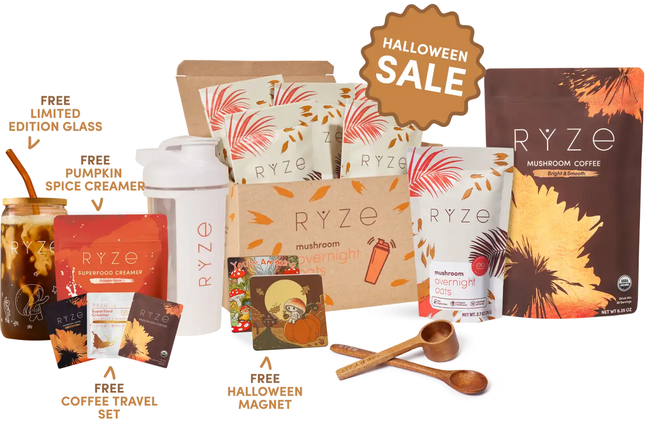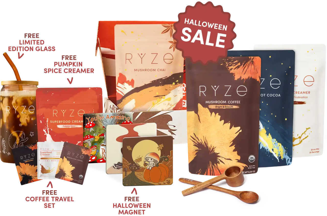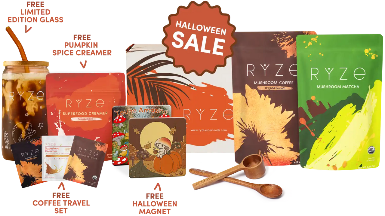 RYZE Mushroom Coffee (30 Servings) RYZE Mushroom Matcha (30 Servings) RYZE Mushroom Chai (20 Servings) RYZE Superfood Creamer (First Order)