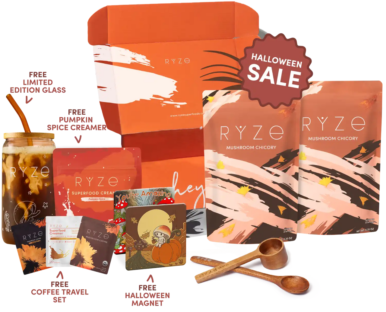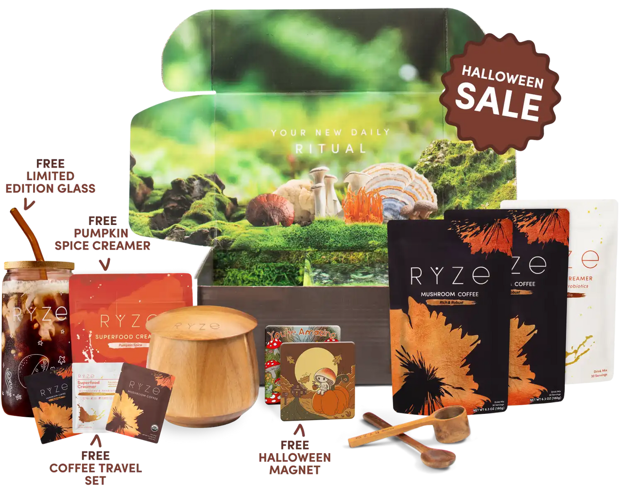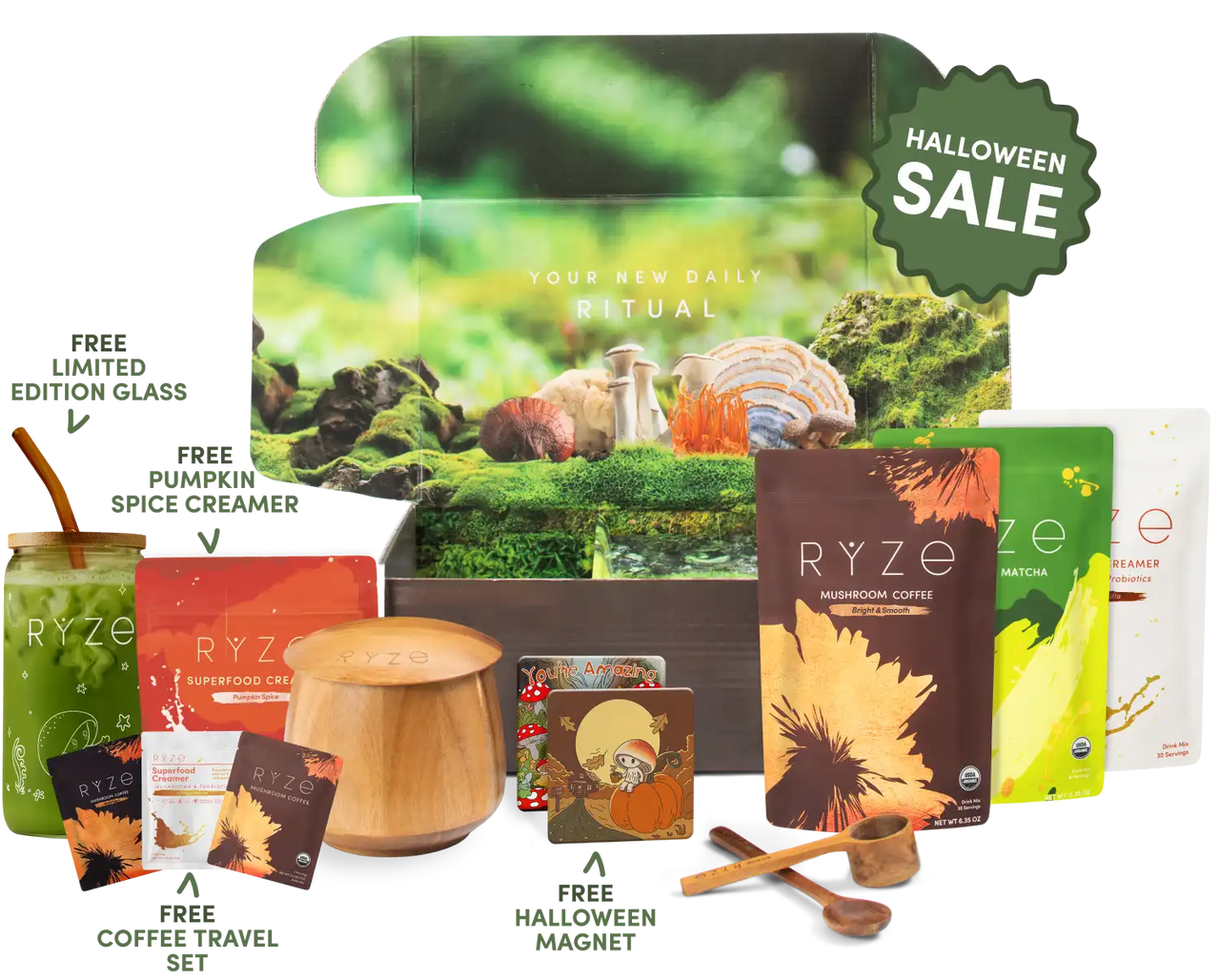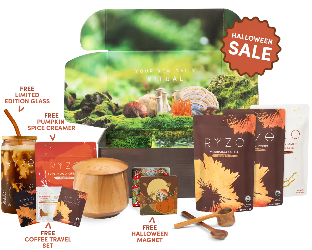 2x Mushroom Coffee (60 Servings) 1x Superfood Creamer (30 servings) FREE Limited Edition Glass FREE Pumpkin Spice Creamer FREE Travel Set Ritual Kit: Jar, Spoon + Scoop