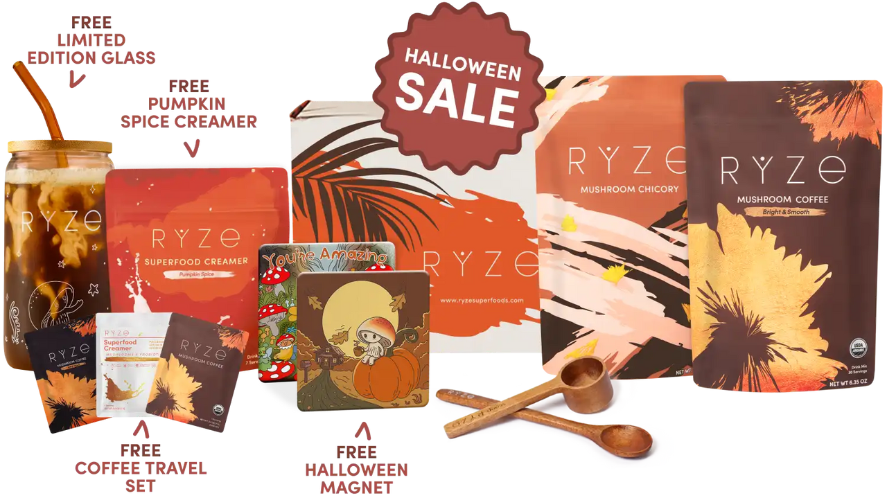Mushroom Coffee (2x) FREE Limited Edition Glass FREE Pumpkin Spice Creamer FREE Travel Set FREE Spoon + Scoop 30-Day Money Guarantee