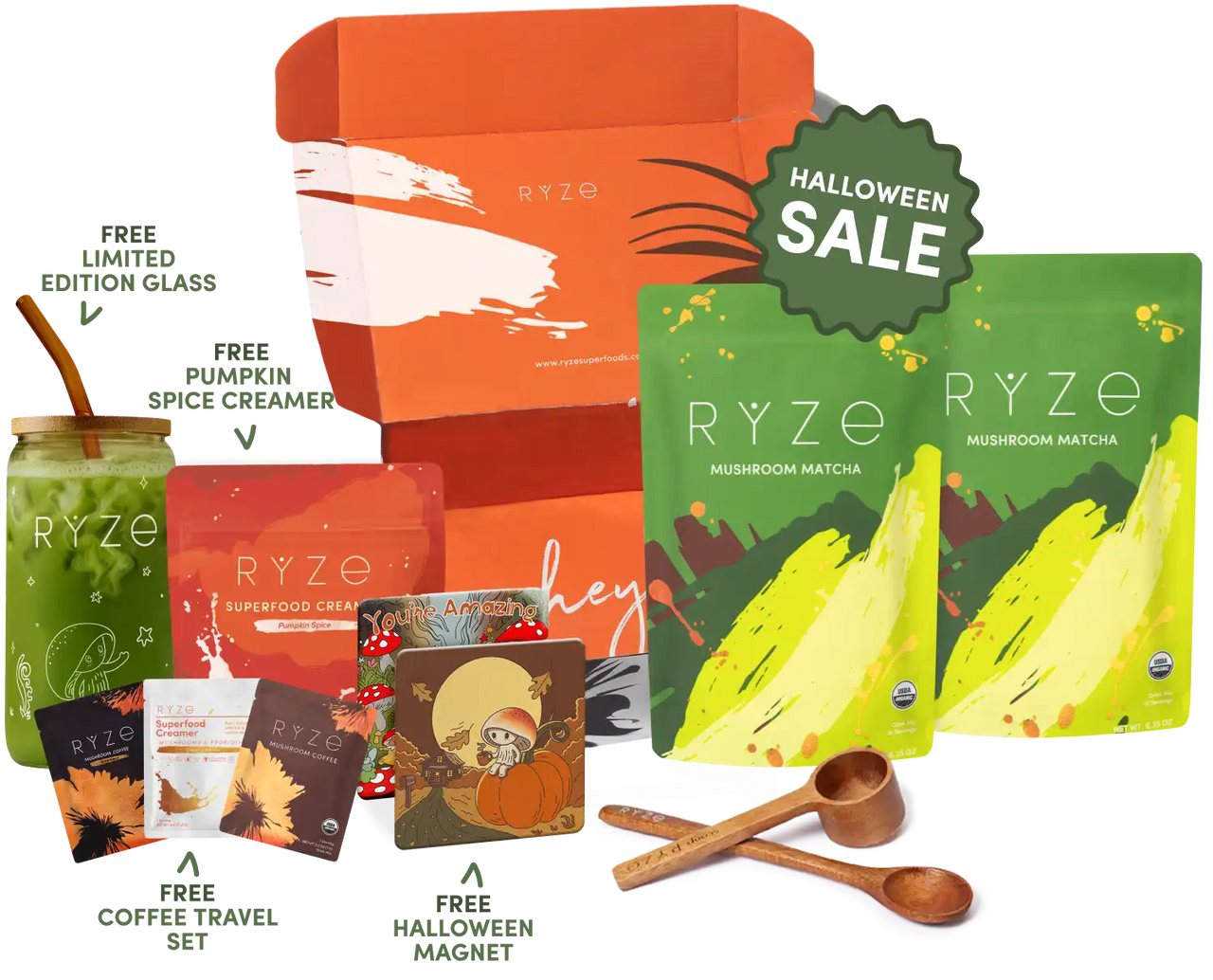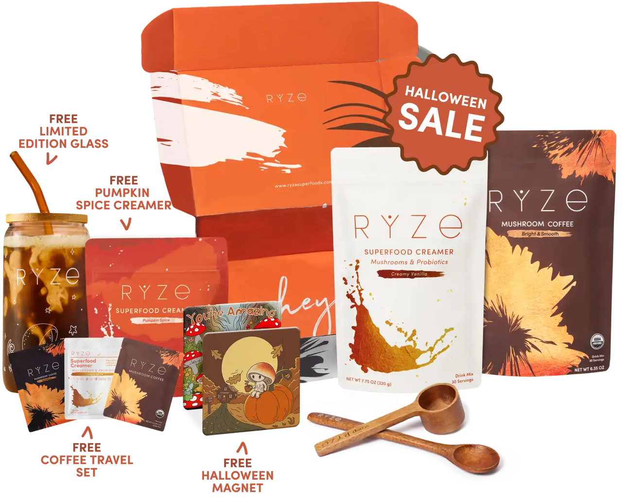 Superfood Creamer (30 Servings) Mushroom Coffee (30 Servings) FREE Limited Edition Glass FREE Pumpkin Spice Creamer FREE Travel Set FREE Spoon + Scoop 30-Day Money Guarantee