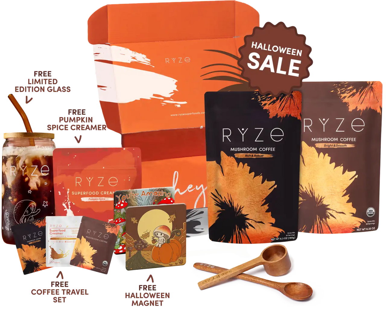 Mushroom Coffee (30 Servings) Mushroom Hot Cocoa (20 Servings) FREE Limited Edition Glass FREE Pumpkin Spice Creamer FREE Travel Set FREE Spoon + Scoop 30-Day Money Guarantee