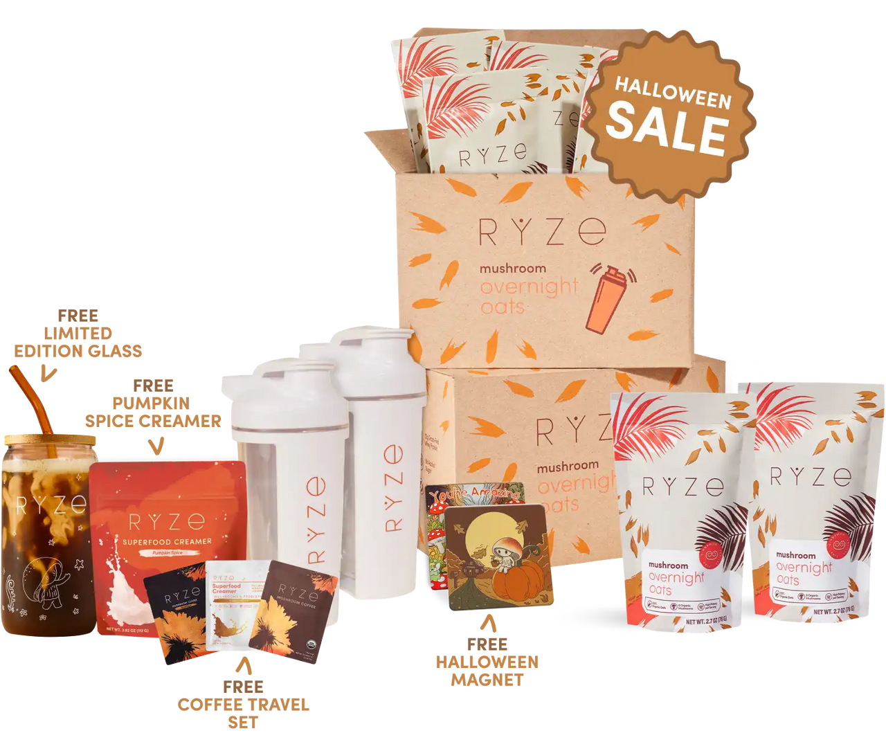 1 Month of Mushroom Overnight Oats (28 Servings) 2 FREE Reusable Shakers FREE Limited Edition Glass FREE Pumpkin Spice Creamer FREE Travel Set 30-Day Money Guarantee