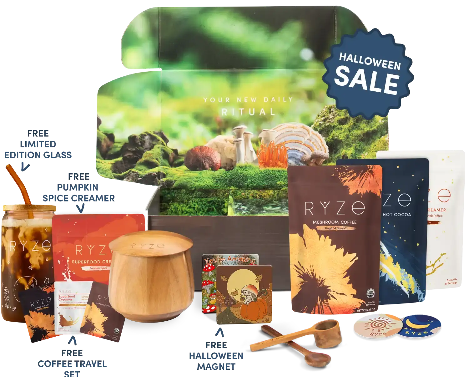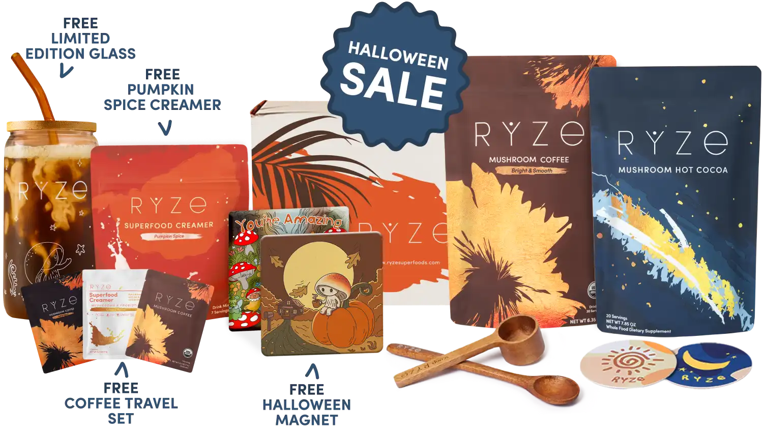 Collection of Ryze products including hot cocoa, wooden utensils, coasters, and a mushroom-themed magnet.