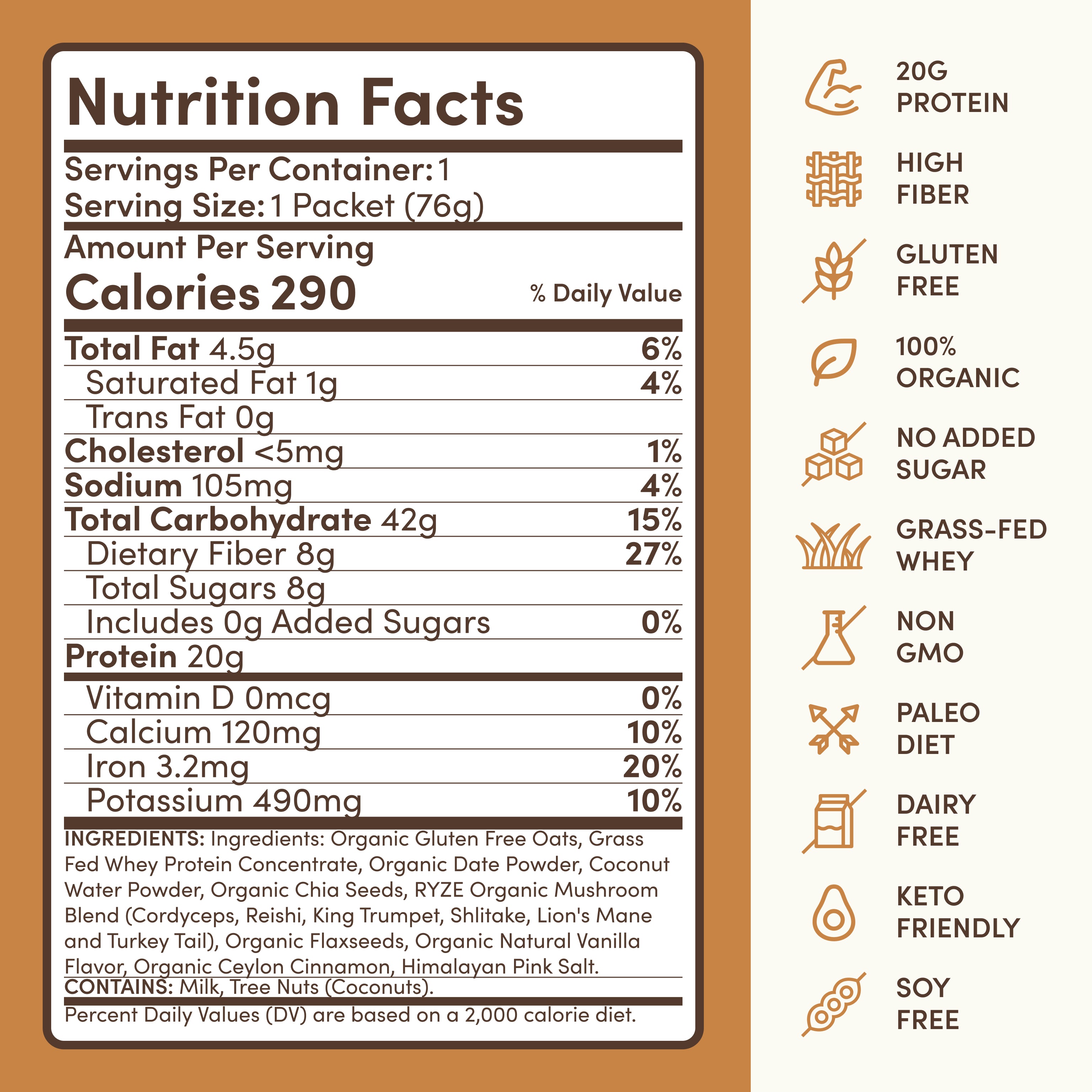Organic oats, our powerful 6-mushroom blend, and 20g of grass-fed whey protein come together for a delicious, easy breakfast. The superfoods don’t stop there, added chia seeds and flax nourish your gut. No sugar. No fillers. Only goodness.